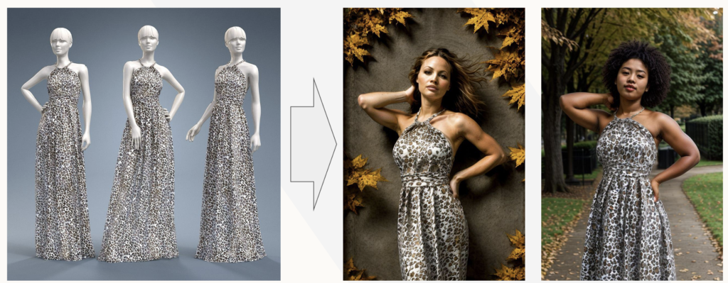 Achieving photorealism in Generative AI Fashion imagery requires accurate simulation of environmental factors, such as lighting and background elements. Whether it’s ambient or direct lighting, these aspects play a crucial role in how clothing appears on virtual models. Properly replicating light sources ensures the images feel natural and realistic. Similarly, background objects need to be rendered in harmony with the scene to avoid distractions and enhance the overall authenticity of the visual.