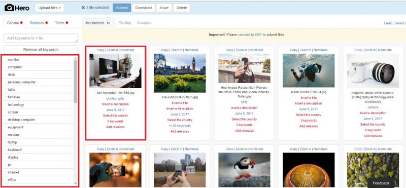 Forward-looking stock websites have started embedding image recognition AI in their platforms to address the need for faster and more efficient keyword tagging. Tools like Qhero use image recognition to offer intelligent keywording to stock contributors of major stock websites like iStock. Using Qhero is very easy, simply upload your photos and they choose for which one you want to receive AI generated tags based on image recognition. Then you can choose the keywords that match the description of the image or simply validate them all.